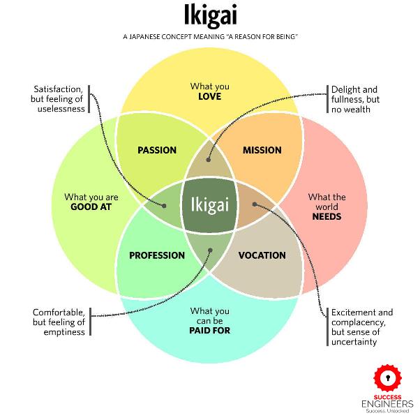 However, the reduced diagram in Fig. 2 (which is our twist on the core elements of Ikigai), is usually enough to get most people going in the right direction, and it will work for you IF you do the work – the thinking – that it requires of you.